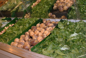 スーパーマーケットの野菜売り場。左から turnip, rootsgreens (蕪), mustard, rutabaga, turnip greens (蕪の葉) |
